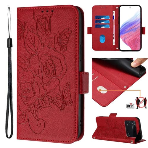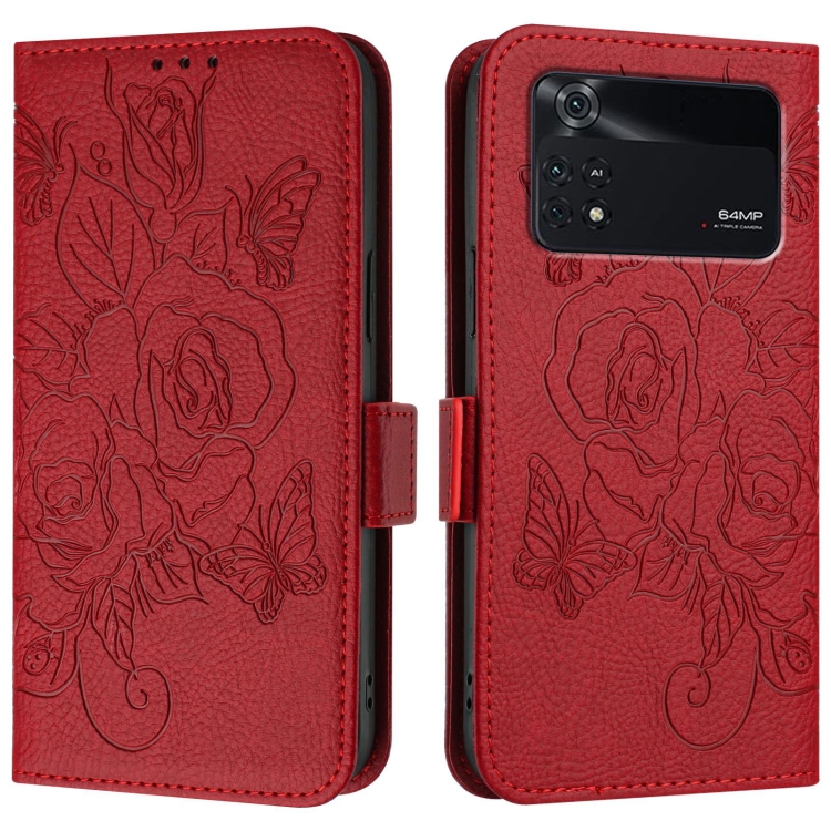 Para Xiaomi Poco M4 Pro 4G Funda para Teléfono de Cuero Antirrobo Rfid con Relieve Rosa (Rojo)