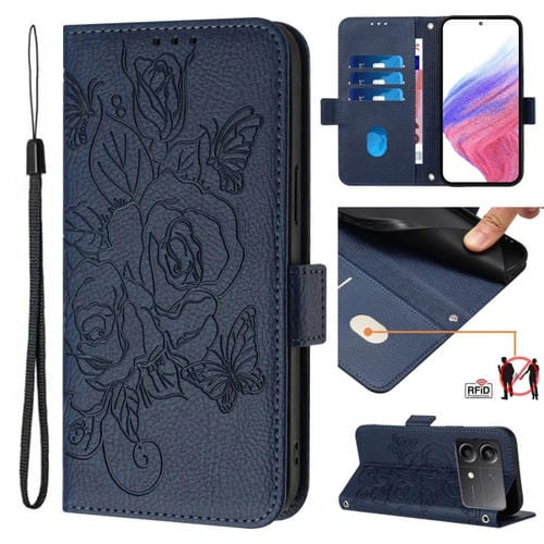 Para Xiaomi Poco X6 Neo 5G Funda para Teléfono de Cuero Antirrobo Rfid con Relieve Rosa (Azul Oscuro)