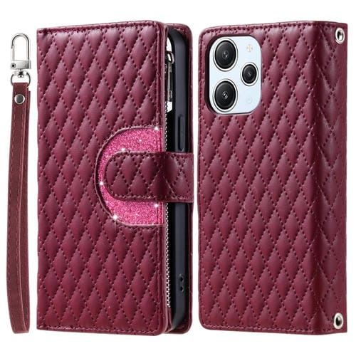 Para Xiaomi Redmi 13 4G Glitter Lattice Zipper Wallet Funda de Cuero para Teléfono (Rojo Vino)