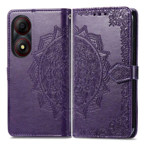 Funda para ZTE Blade A34 de Cuero con Relieve de Flores Mandala (Púrpura)