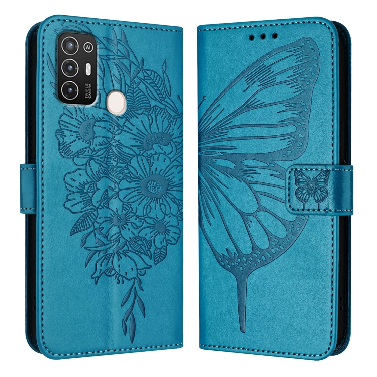Funda de Cuero para ZTE Blade A52 con Mariposa en Relieve (Azul)