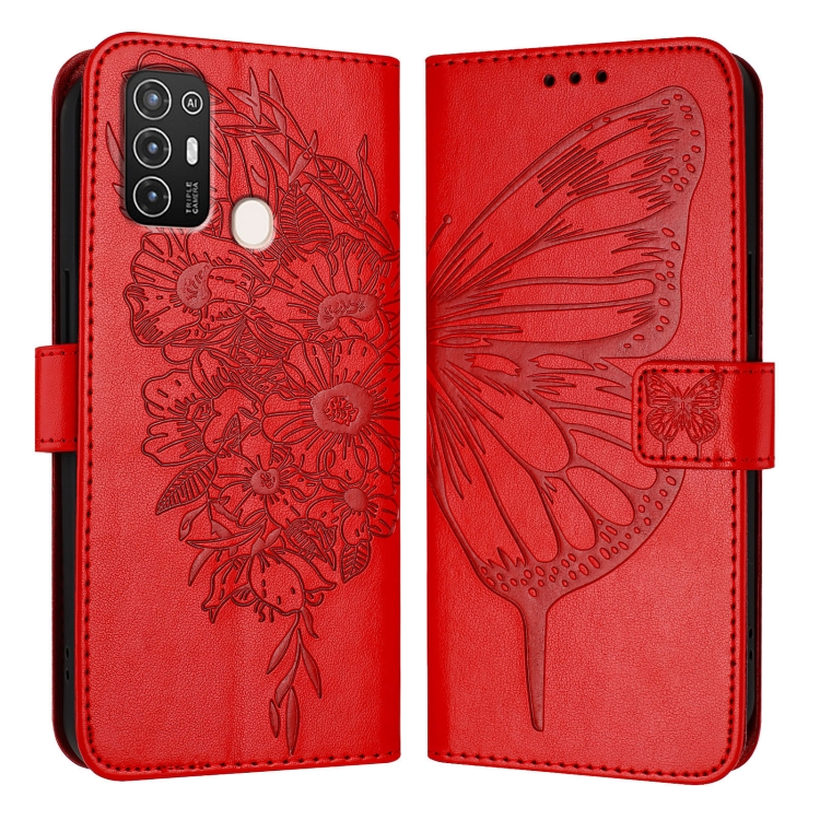 Funda de Cuero para ZTE Blade A52 con Mariposa en Relieve (Rojo)
