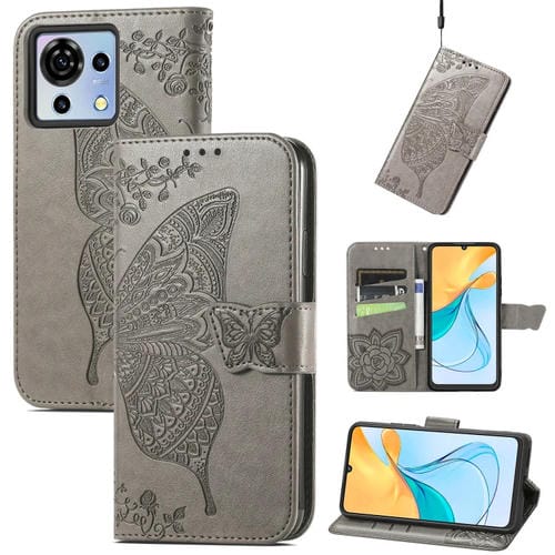 Funda de Cuero para ZTE Blade V50 Vita Butterfly Love Flower en Relieve (Gris)