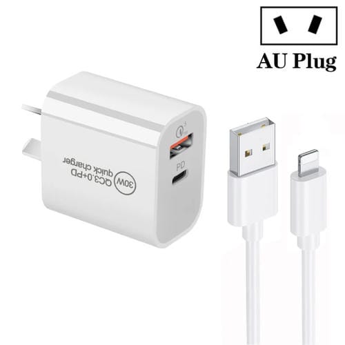 Cargador Dual USB Pd30W USB-C Type-C + QC3.0 con Cable 1 m 8 Pines (AU)