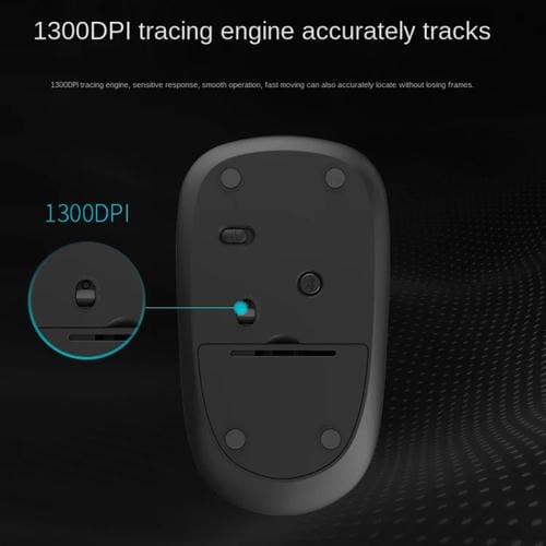 • Resolución óptica de 1300 DPI, tres teclas silenciosas (Izquierda, Derecha y central), aceleración de 10g, tamaño 113x64x30 mm, peso 60 g, distancia de funcionamiento hasta 10 metros, Alimentación mediante 1 Batería AA (no incluida)
