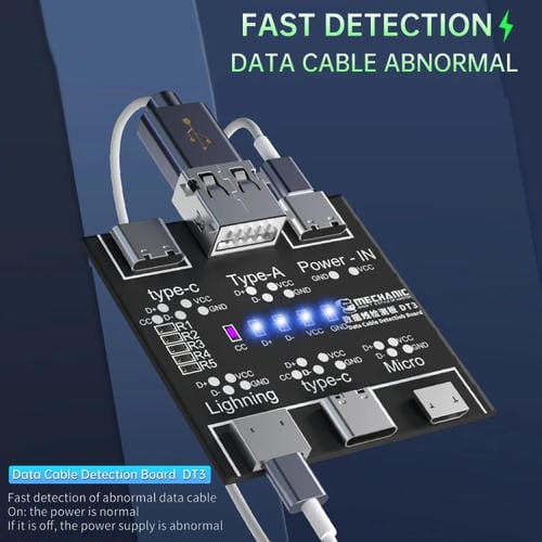 El Probador de Conmutación de Encendido y Apagado para Placa y Detección de Cortocircuito en Cable de Datos USB Mechanic DT3 es una herramienta especializada diseñada para la verificación rápida y precisa del estado funcional de Cables de datos USB en diferentes formatos, incluyendo USB estándar, Tipo-C (dos variantes), Micro USB y Lightning. Este dispositivo permite detectar fallos de Carga y transmisión de datos mediante un sistema de luces indicadoras, facilitando la identificación de problemas en líneas de datos y cortocircuitos en Placas relacionadas. Su diseño compacto y ultraligero, con dimensiones aproximadas de 48,5x45 mm y un peso de 12 gramos, lo hace ideal para técnicos y usuarios que reparan por cuenta propia, mejorando la eficiencia en la detección y diagnóstico de Cables USB y Conectores. Funciona con una Corriente de salida de 1A y un voltaje de 5V, utilizando una interfaz tipo C para la fuente de Alimentación.