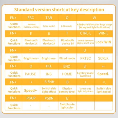 - 67 teclas, Batería de 4000 mAh, Conexión 2,4 GHz, Bluetooth y Cable Tipo C, dimensiones 325,09 x 115,62 x 43,81 mm, peso aproximado 804 g, 15 tipos de iluminación RGB con 16 millones de colores, teclas intercambiables en caliente, teclas multimedia con función FN