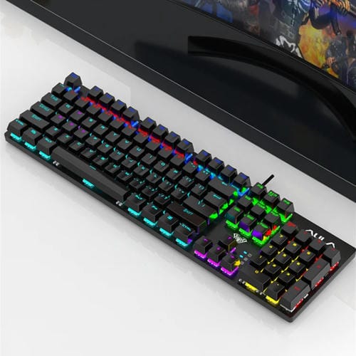 - 104 teclas mecánicas con diseño sin carrera de 26 teclas, vida útil de 60 millones de pulsaciones, Cable USB de 1,6 metros, dimensiones 435x135x38 mm, ángulo de inclinación ajustable a 6 grados