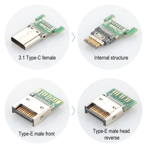 - Permite la conversión y Conexión entre interfaces USB Tipo-E y USB Tipo C de forma segura y estable