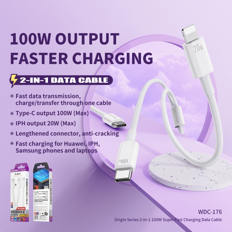- 1x Cable 2 en 1 WK WDC-176 100W USB-C a USB-C + 8 Pines Carga Rápida 1,2 m