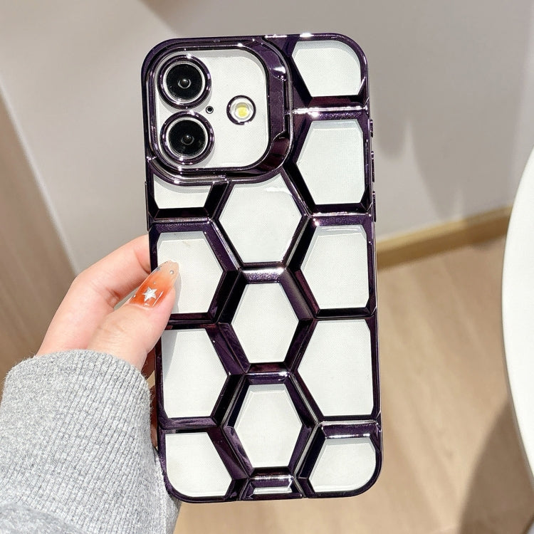 Funda TPU Transparente Panal de Abeja 3D Grabado Láser Galvanizado para iPhone 16 (Morado)
