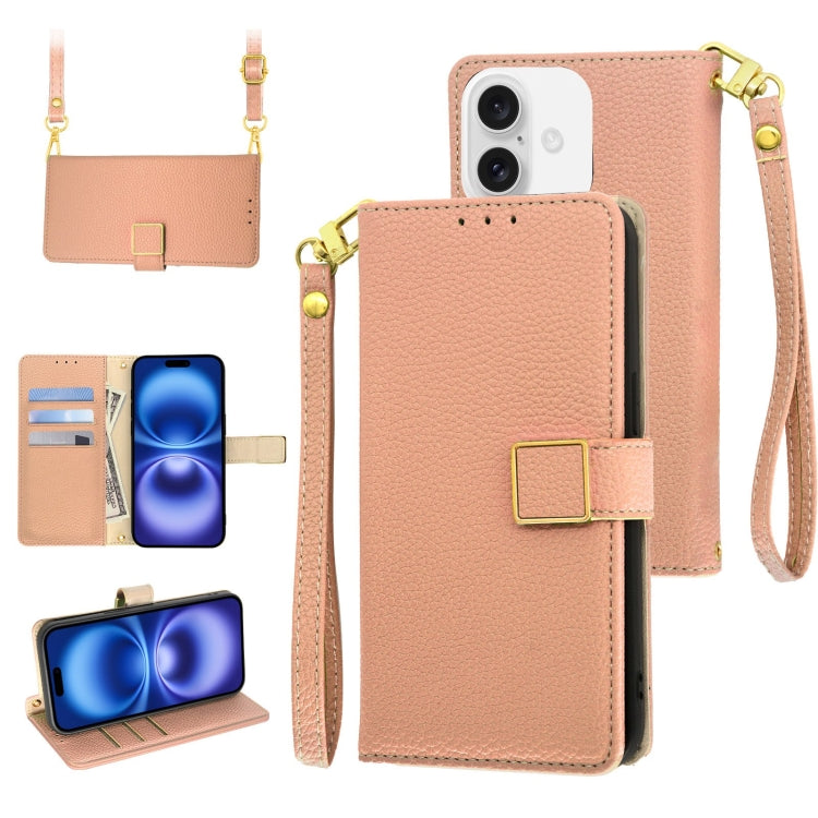 Funda de Cuero para iPhone 16 con Hebilla Cuadrada y Textura de Lichi (Oro Rosa)