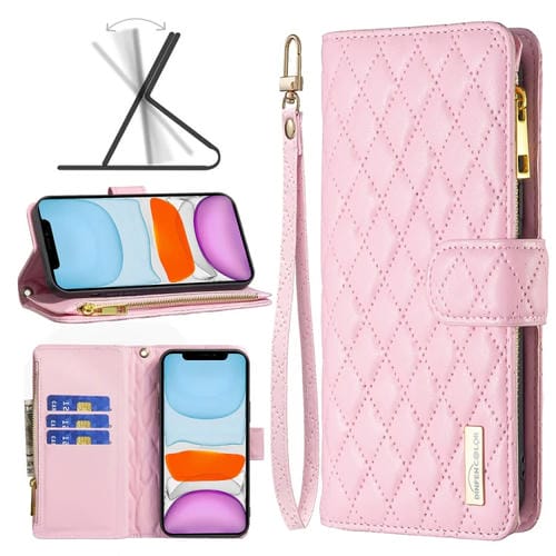 Funda para iPhone 11 Diamond Lattice Zipper Wallet de Cuero con Tapa (Rosa)