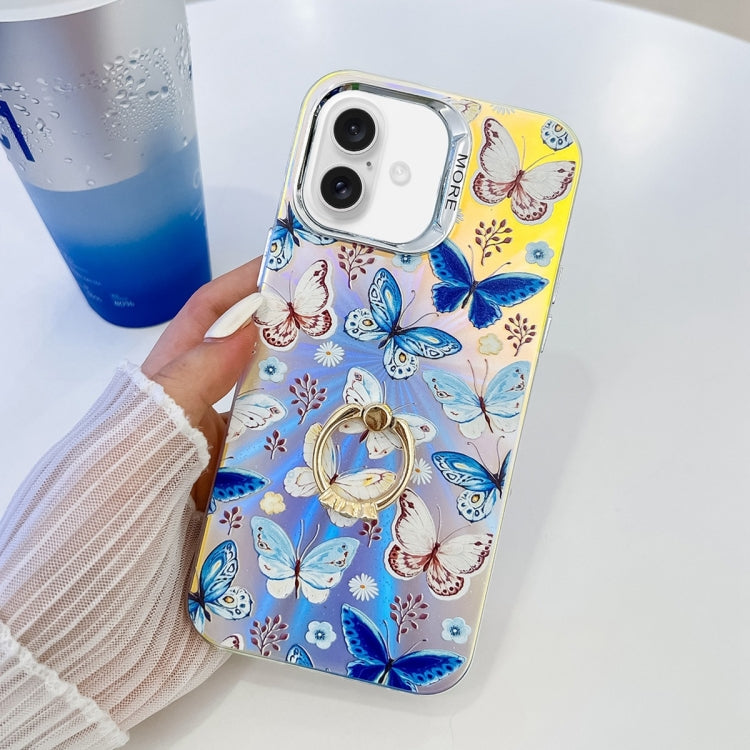 Estuche para Teléfono iPhone 16 Plus con Soporte Anillo Mariposa Láser Galvanoplastia (Azul)