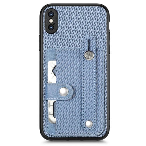 Funda para iPhone Xs Max Wristband Kickstand Card Wallet Back Cover con Tool Knife (Azul)
