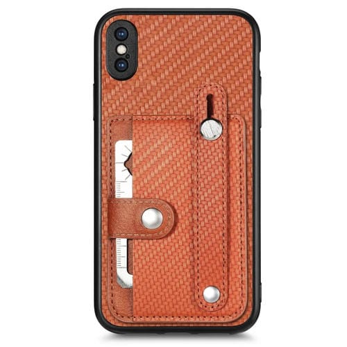 Funda para iPhone Xs Max Wristband Kickstand Card Wallet Back Cover con Tool Knife (Marrón)