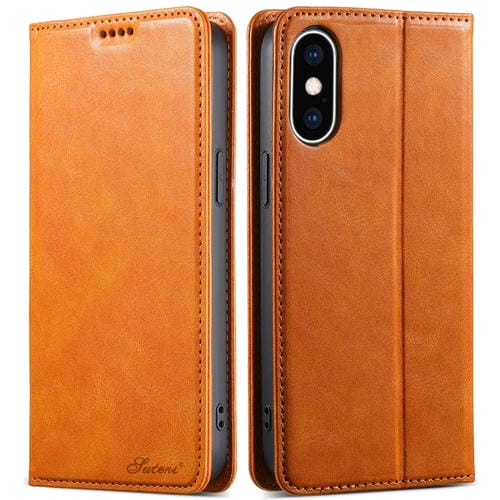 Funda de Cuero Suteni J02 para iPhone X y Xs con Billetera y Cera de Aceite (Caqui)
