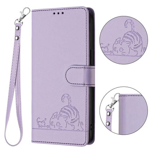 Funda para teléfono PU iPhone 13 Pro Max con patrón relieve gato y rata RFID con correa (Azul)