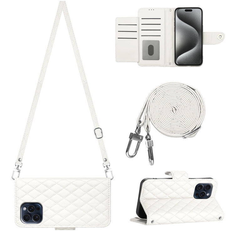 Funda para teléfono iPhone 15 Pro Max con tapa de cuero textura rómbica y cordón largo (Blanco)