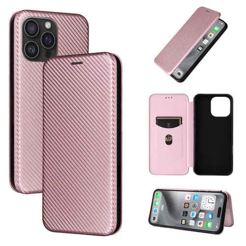Funda de Cuero con Tapa y Textura de Fibra de Carbono para iPhone 16 Pro Max (Rosa)