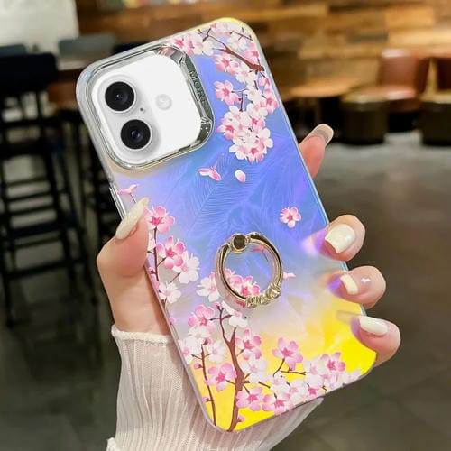 Funda de TPU para iPhone 16 con Soporte para Anillo de Flores Galvanoplastia Láser (Peach Blossom)