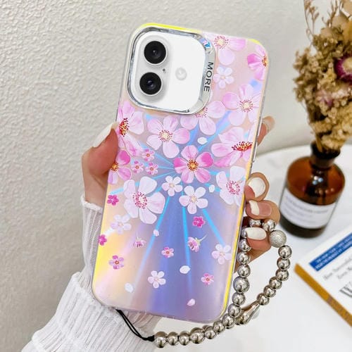 Funda para Teléfono iPhone 16 Peony Ah11 Flor Láser Galvanizada con Correa para la Muñeca