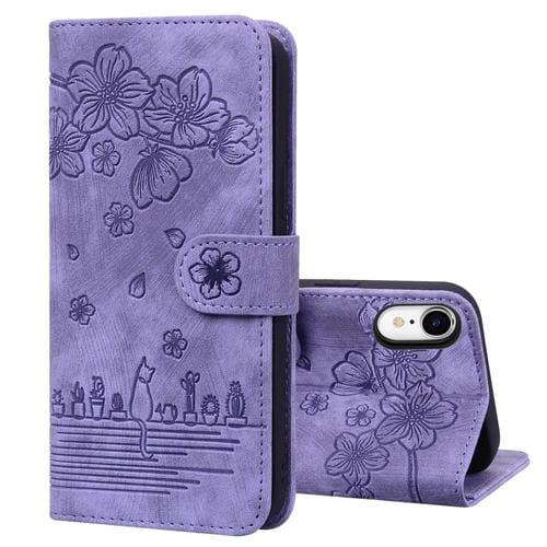 Estuche de Cuero para iPhone Xr Cartoon Sakura Cat En Relieve (Púrpura)