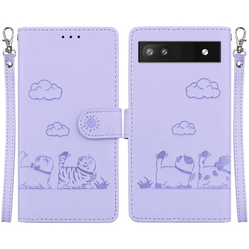 Funda de Cuero Rfid para Google Pixel 6A con Diseño de Gatos (Morado)