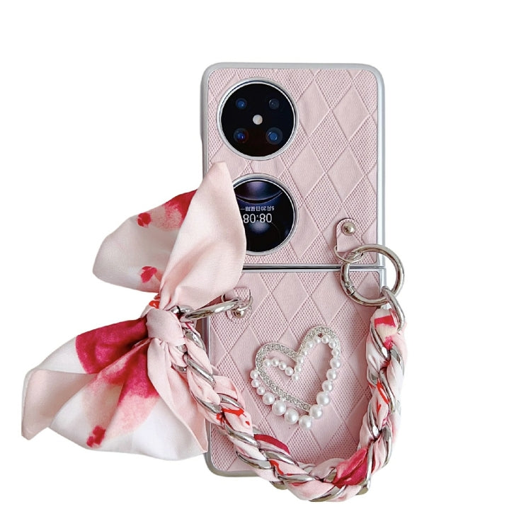 Funda para Huawei P50 Pocket con Textura de Cuero, Bufanda y Pulsera Corazón, Antigolpes (Rosa)
