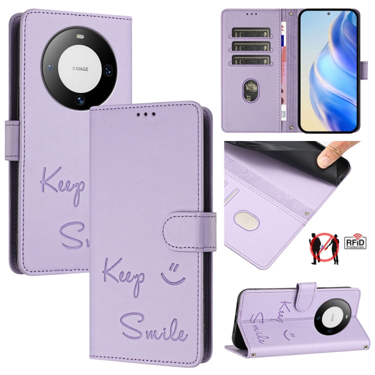 Funda de Cuero Rfid con Relieve Sonriente para Huawei Mate 60 Pro/60 Pro+ (Morado Claro)