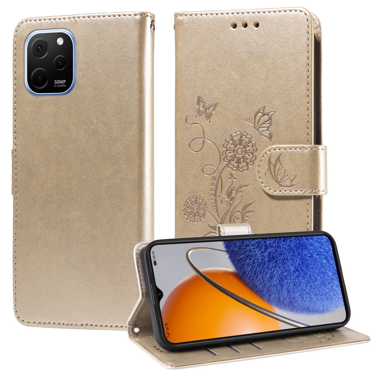 Funda de Cuero Huawei Nova Y70 Plus con Diseño de Mariposas y Flores en Relieve (Dorada)