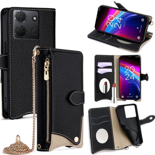 Funda de Cuero Tipo Lichi para TCL 503 con Diseño de Cola de Pez y Cadena Cruzada (Negro)