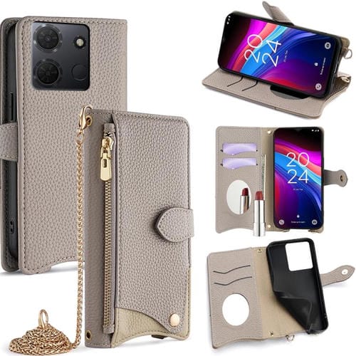 Funda de Cuero Lichi para TCL 503 con Diseño Cola de Pez y Cadena Cruzada (Gris)