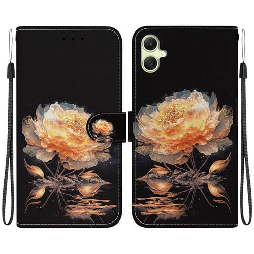 Estuche de Cuero Samsung Galaxy A05 con Dibujo Coloreado y Textura de Cristal (Peonía Dorada)