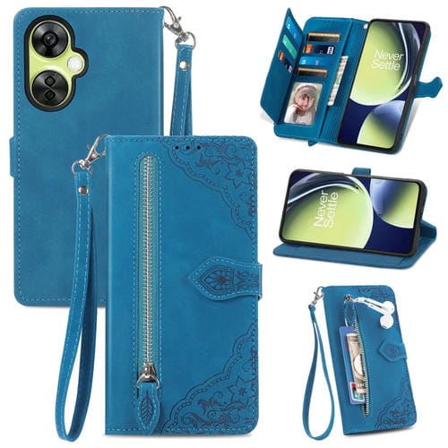 Estuche para OnePlus Nord Ce 3 Lite de Cuero con Cremallera y Flores en Relieve (Azul)