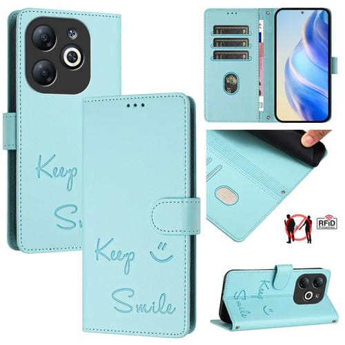 Funda de Cuero Rfid con Relieve Sonriente para Teléfono Infinix Smart 8 (Verde Menta)