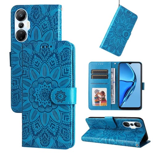 Estuche para Teléfono Infinix Hot 20 4G Cuero con Estampado de Girasol en Relieve (Azul)