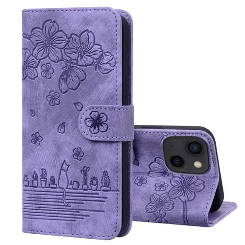 Estuche para iPhone 13 Mini Cartoon Sakura Cat Cuero En Relieve (Púrpura)