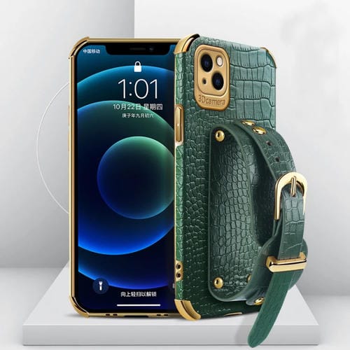 Estuche para iPhone 13 Mini Cuero TPU Galvanizado Patrón Cocodrilo con Correa (Verde)