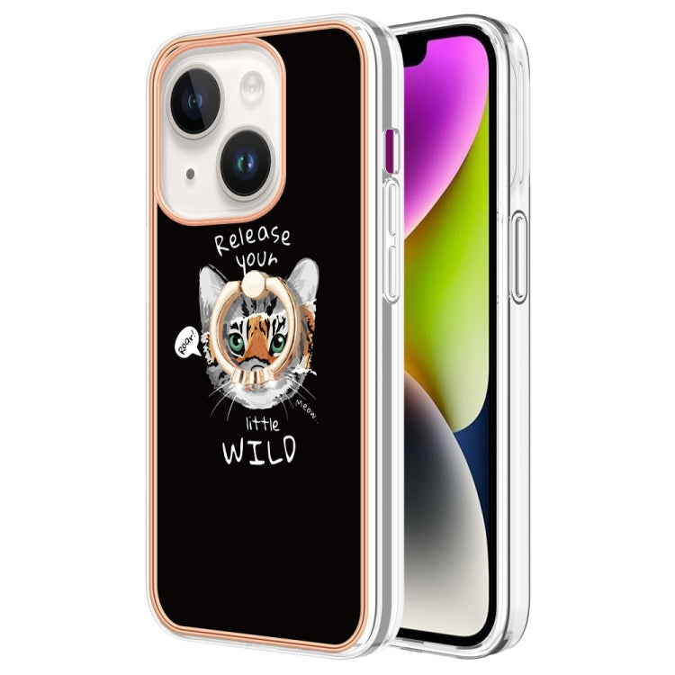 For iPhone 15 Plus Electroplating Double-sided IMD Phone Case with Ring Holder (Natural Growth)