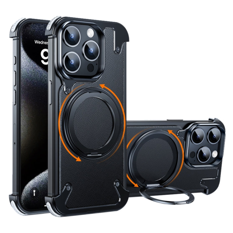 Caja de Teléfono para iPhone 15 Pro Max Metal con Soporte Magsafe Rotación 360 (Cuero Negro)