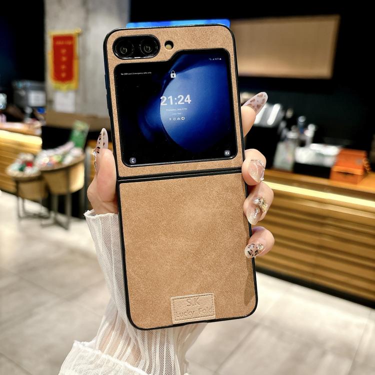 Funda de piel de cordero y corcho para Samsung Galaxy Z Flip6 5G, color marrón (borde negro)