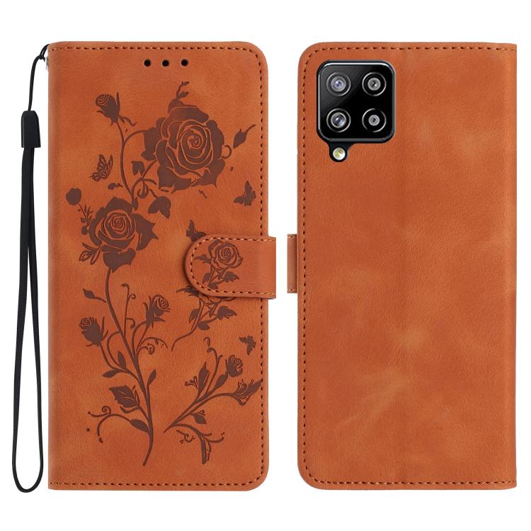 Funda de piel con estampado de rosas en relieve para Samsung Galaxy A32 (marrón)