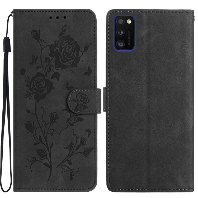 Funda de cuero con estampado de rosas en relieve para Samsung Galaxy A41 (negra)