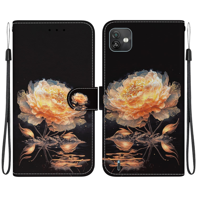 Estuche de Cuero para Wiko Y82 con Dibujo Coloreado y Textura de Cristal (Peonía Dorada)
