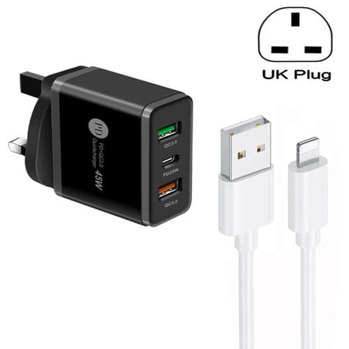 Cargador USB Multipuerto 45W Pd25W + 2x Qc3.0 con Cable USB a 8 Pines (Negro)