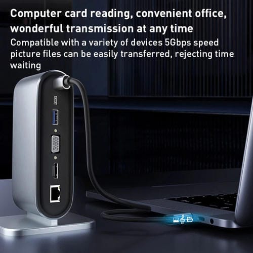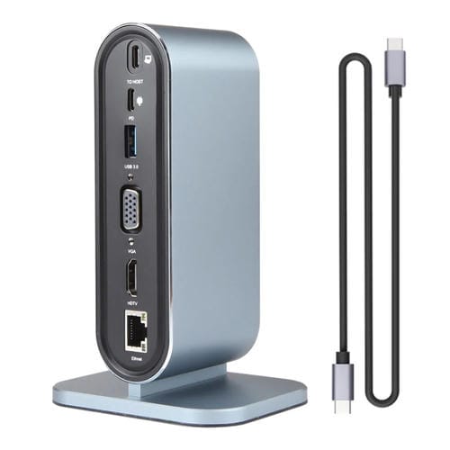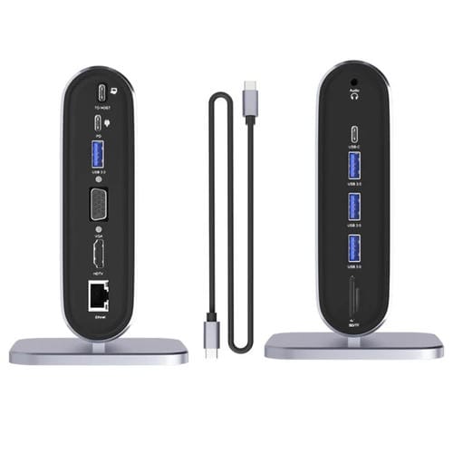 - Interfaces: USB Tipo-C, 4 Puertos USB 3.0, Carga PD 100W, VGA 1080P, salida 4K, LAN, Lector de Tarjetas SD y TF, Conector de audio de 3,5 mm