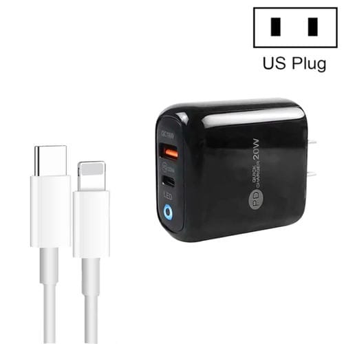 Cargador móvil PD04 Tipo C + USB con cable Tipo C a 8 Pines enchufe EE. UU. (Negro)
