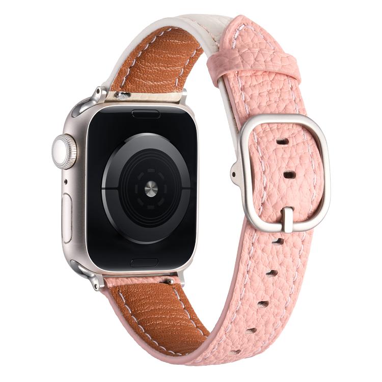 Correa de cuero genuino con textura de lichi y hebilla cuadrada para Apple Watch de 42 mm, 41 mm, 40 mm y 38 mm (blanco y rosa)
