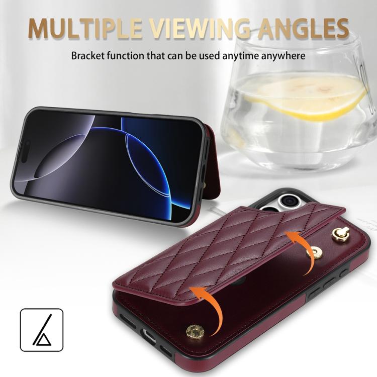 Estuche para Teléfono iPhone 16 Pro Max Ranuras para Tarjetas Hebilla Doble Rombal con Cordón (Rojo Vino)